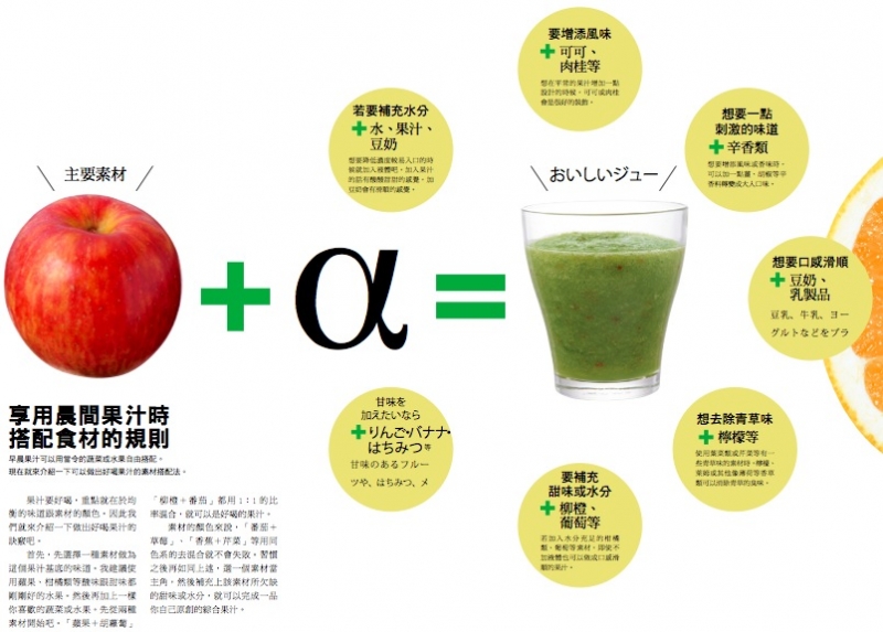 蔬果中含有許多對人體有益的成份,像是酵素,可以幫助人體消化;美容肌膚的維他命A、C、E、幫助代謝排便的鐵質、鈣質等礦物質以及維他命B群;抗氧化成分的多酚、茄紅素、能抗水腫的鉀…。一天一杯富含多種營養的蔬果汁,可以達到瘦身、美膚、清腸、抗老以及消除壓力的功效。